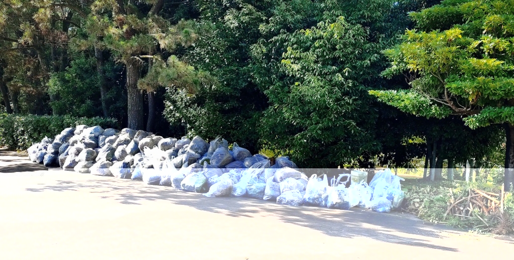 今年も猛暑の中で善光寺裏~献忠寺裏の範囲で、早朝7時から約1時間を掛け事前に刈り取った雑草、漂着ゴミ、投棄ゴミなど大量のゴミを回収していただきました。